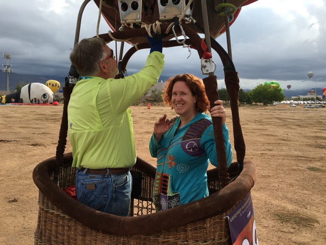 It was a pleasure to have you join Thursday’s Child chase crew at Fiesta this year. I managed to fly all the chase crew that were willing to fly, and the Boomers rally folks certainly added to the enthusiasm. If you see a balloon flying anywhere, chase it and tell them you’ve chased and flown at Albuquerque – you’ll win points! Best regards, Fred and Christel Dinkler, Canyon Lake, TX