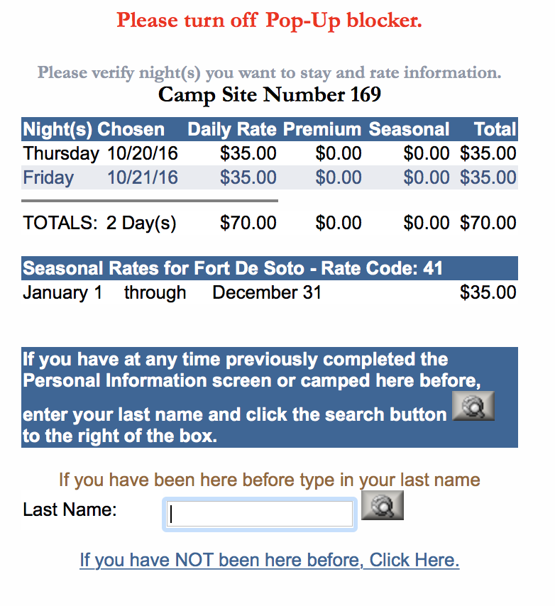 - After acknowledging the loop information, it brings up a little bit of info about the site. And then you have to enter in your date range AGAIN into a pop-up calendar by clicking on the dates you want one-by-one, IN DATE ORDER.