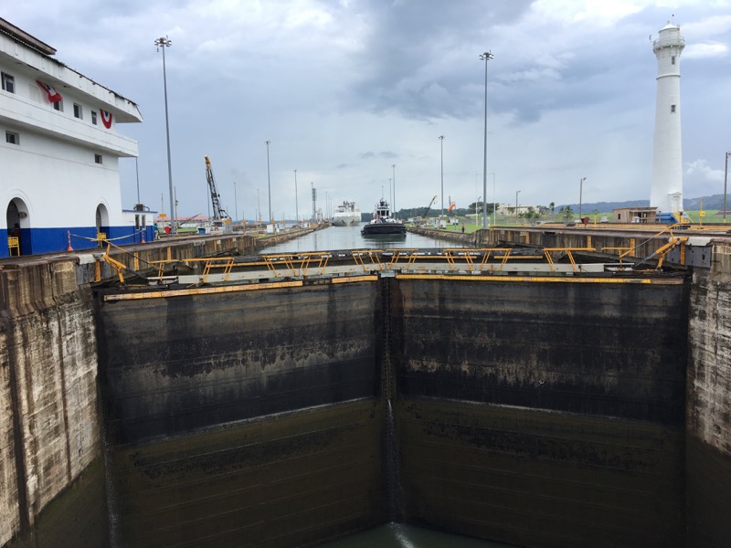Our ship would enter from the Caribbean side, go through the 3 locks and then anchor in Gatun Lake just long enough to drop off shore excursion passengers. Some of the excursions took folks to the visitors center, and one through the entire canal. The ship then turns around, goes back through the locks and docks in Colon – where the passengers meet up with us.