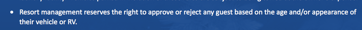- Past Problems – Usually when you see a rule, there’s a reason or story behind it. Perhaps the park owner had past issues with an older RV breaking down in their park, leaving oil stains on their concrete pad, a failed plumbing system that created a stinky mess or dealing with complaints from other customers. Or perhaps a park currently has what they deem as too many older RVs in their park, and they’re trying to filter for newer RVs.