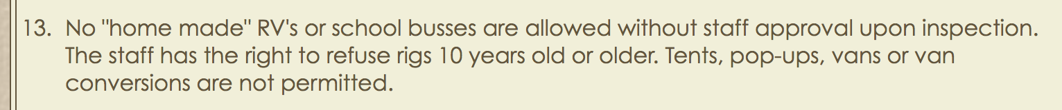 Have an older RV and worried about this rule? Join the My RV is too old for your park Facebook group, where they’re tracking parks with this rule, and sharing in the pain.