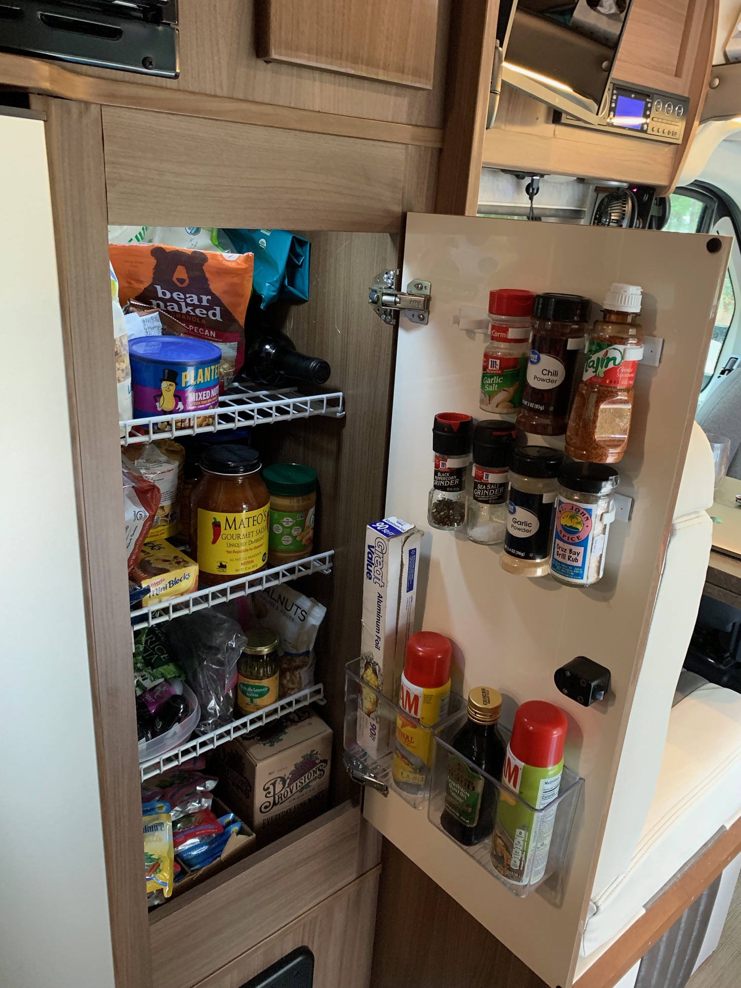 • No Pantry?!? – By default, the cabinet next to the fridge is set up with a bar for hanging clothes instead of shelves for storing groceries. Why? Shelves would be vastly more practical – and Winnebago could have designed the shelves to be removable for those that really want to hang up a shirt. Retrofitting shelves after the fact is never going to be as good as having them properly anchored and built in.