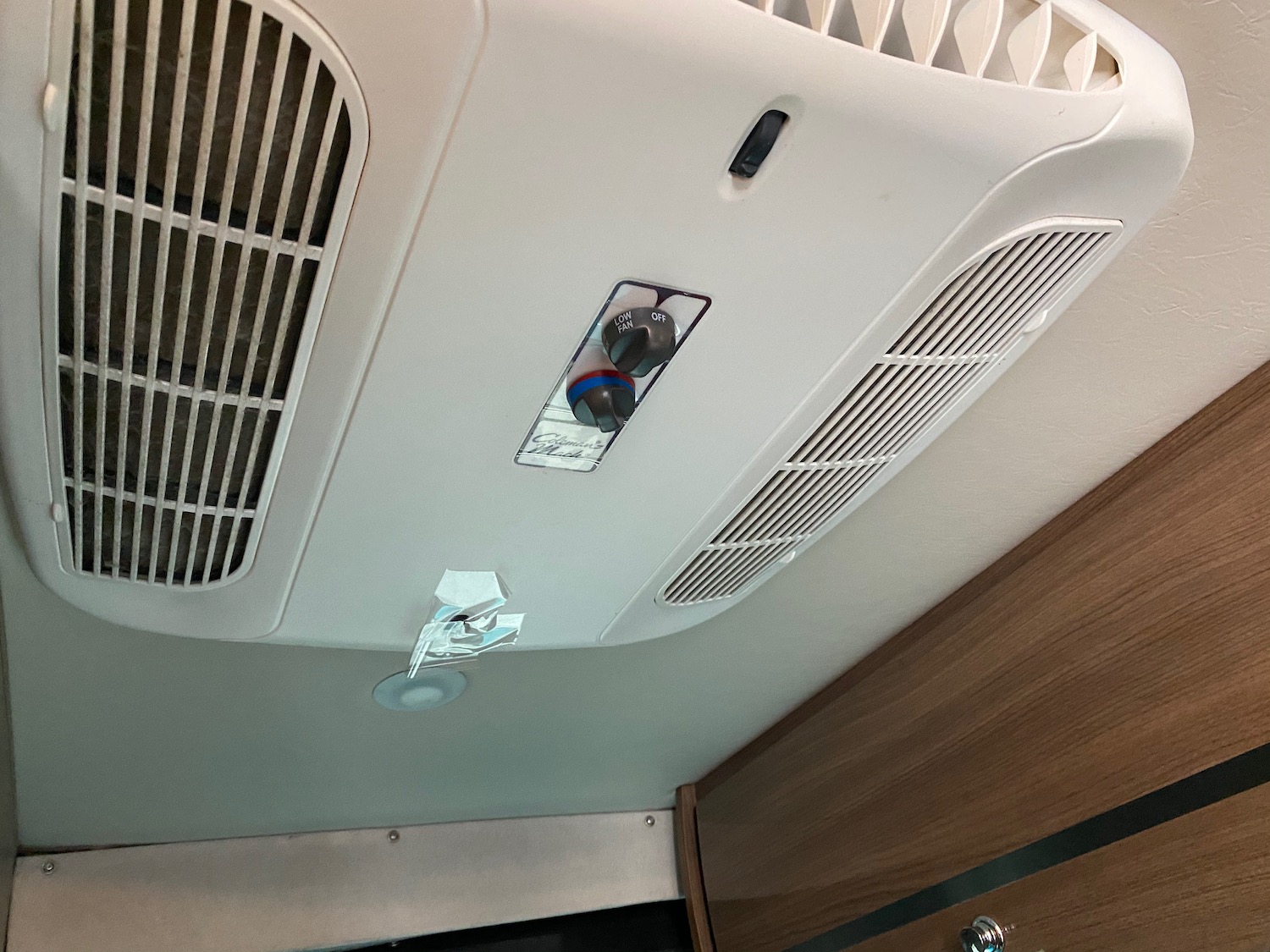 The cheap vent adjustments that are possible for aiming the AC don’t even stick without using tape to hold the adjustment arms in place. We consider the AC to be poorly designed all around. We found USB fans to be an essential airflow aid – and wish the AC had been mounted mid-van instead of in the rear.