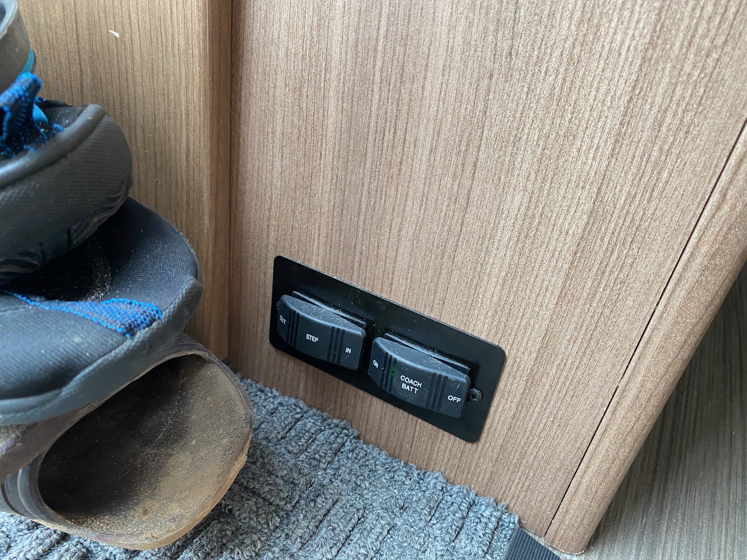 “Battery Switch Placement — The battery switch that cuts off all power inside the van is placed right inside the door, right in a location that is extremely easy to accidentally kick. Whoever put this switch in this location has clearly never spent a night in an RV! ”