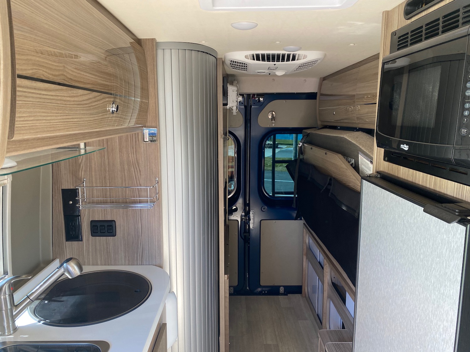 However, Winnebago did add in a little window in the kitchen – which is a much larger improvement than it seems. The extra light in the back is amazing, and Kiki loves having a window view while she laps up her water. The window also bumps out the wall behind the counter a bit, adding a little bit of a shelf which is perfect for storing things like spices.