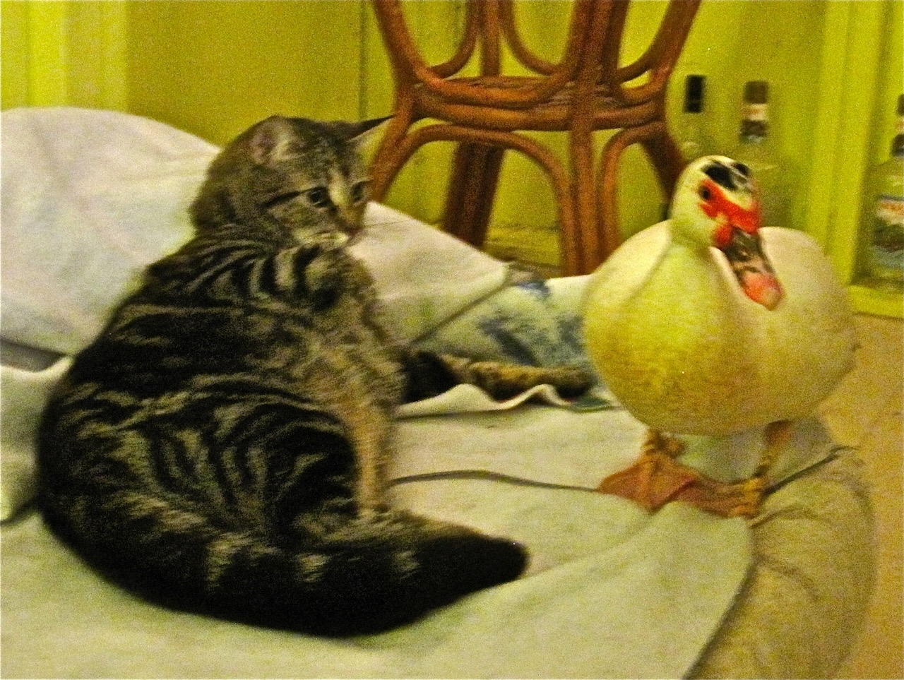 As soon as we sat down to dinner, three tiny baby kittens crawled up into Cherie’s lap – and Martha asked us if we wanted a cat.