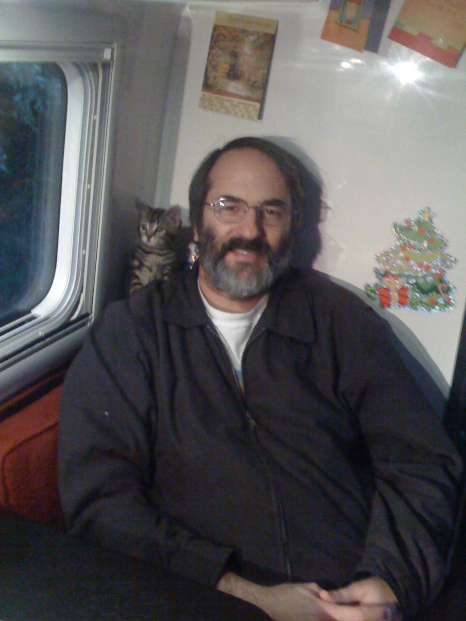 When we had first hit the road together in 2007 – Cherie left behind her cat Alma with a loving ex. Alma just wasn’t made for road life. Chris had lived with cats some before too – though a history of cat allergies made him wary. Would a new cat trigger him?