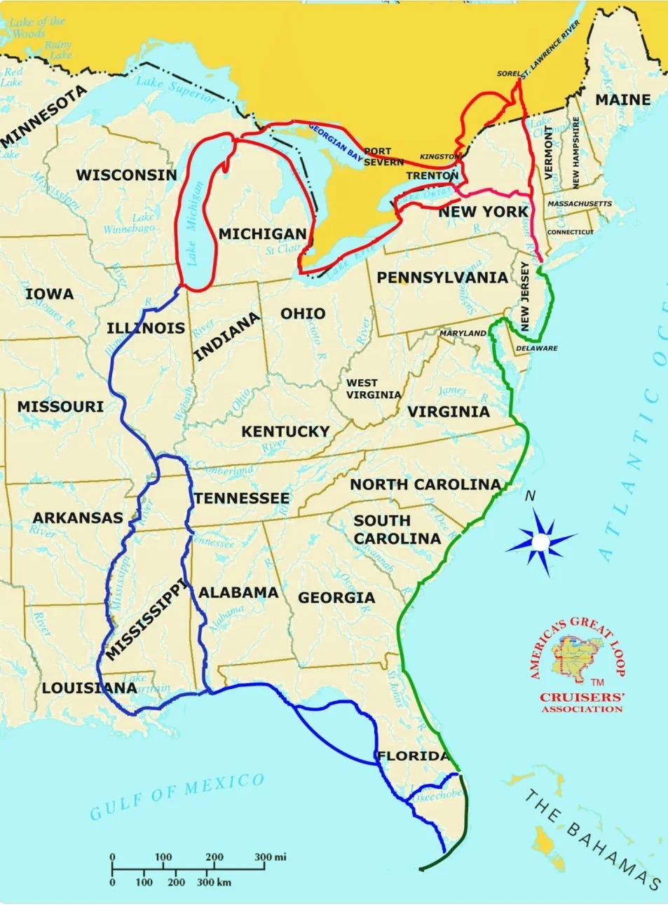 “Loopers cruise the 6,000-mile Great Loop route aboard their own boats completing a circumnavigation of the eastern U.S. and part of Canada via mostly protected inland waterways. The Great Loop route follows the Atlantic Intracoastal Waterway, the Chesapeake Bay, and the New York Canals northwards, goes across the Great Lakes, south on the Inland Rivers, and then east (across the) Gulf Coast to complete the Loop.”