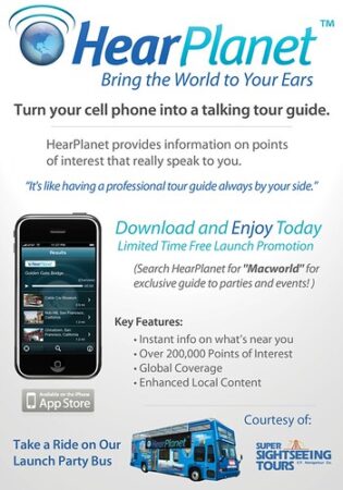 We handed out these flyers around MacWorld – inviting people to hop on our party bus for an app demo. 2008/2009 – HearPlanet – Apple first released the App Store in July 2008, and MacWorld in January 2009 was the first major trade show with a focus on apps. To make a splash – San Francisco tech startup HearPlanet hired us as Launch Specialists to come up with a plan to debut their audio tour guide app. We delivered – with a double-decker DJ-blasting tour bus circling MacWorld and taking media and VIP’s around San Francisco. It was a wild experience – and resulted in major media coverage and press features, and HearPlanet even ended up featured in Apple advertisements.