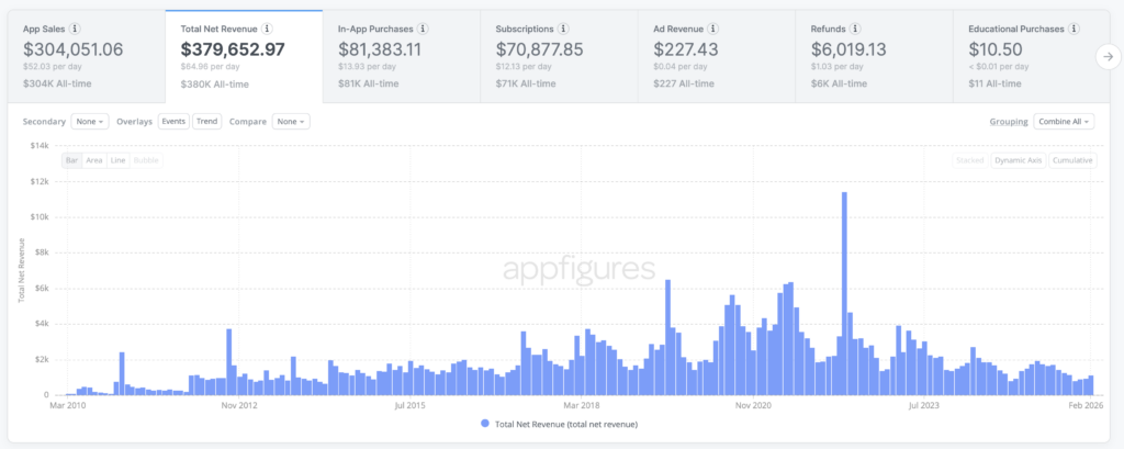 - Lifetime Net Revenue: $379,473.36 (after App Store fees and refunds are processed)