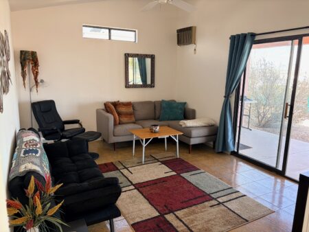 Our casita, called the Cat-sita, is right at the max size of 288 square feet, and is 12′ x 24′ (including our porch). One thing we discovered after touring so many is that ours is a bit unique in how open ours is including our high vaulted ceilings.